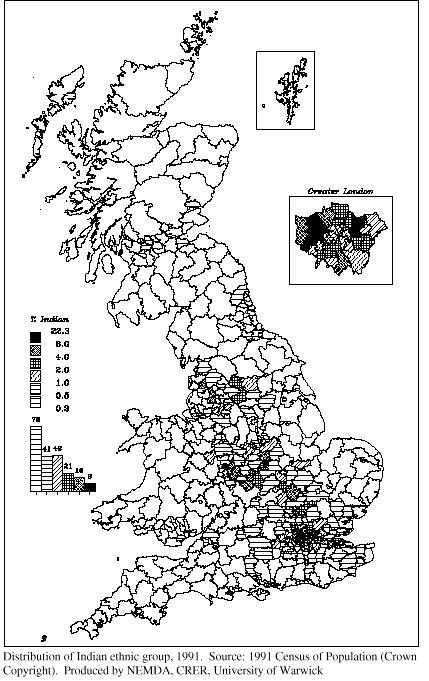 Maps of the geographical distribution of South Asian ethnic groups in Great Britain, 1991